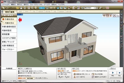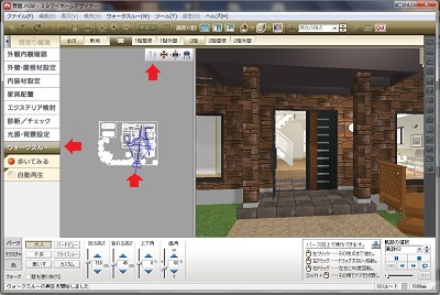 ■ウォークスルーや光源設定 家の中を歩き回っているような動画で再生! 太陽と照明の光源設定で影や採光を演出! |